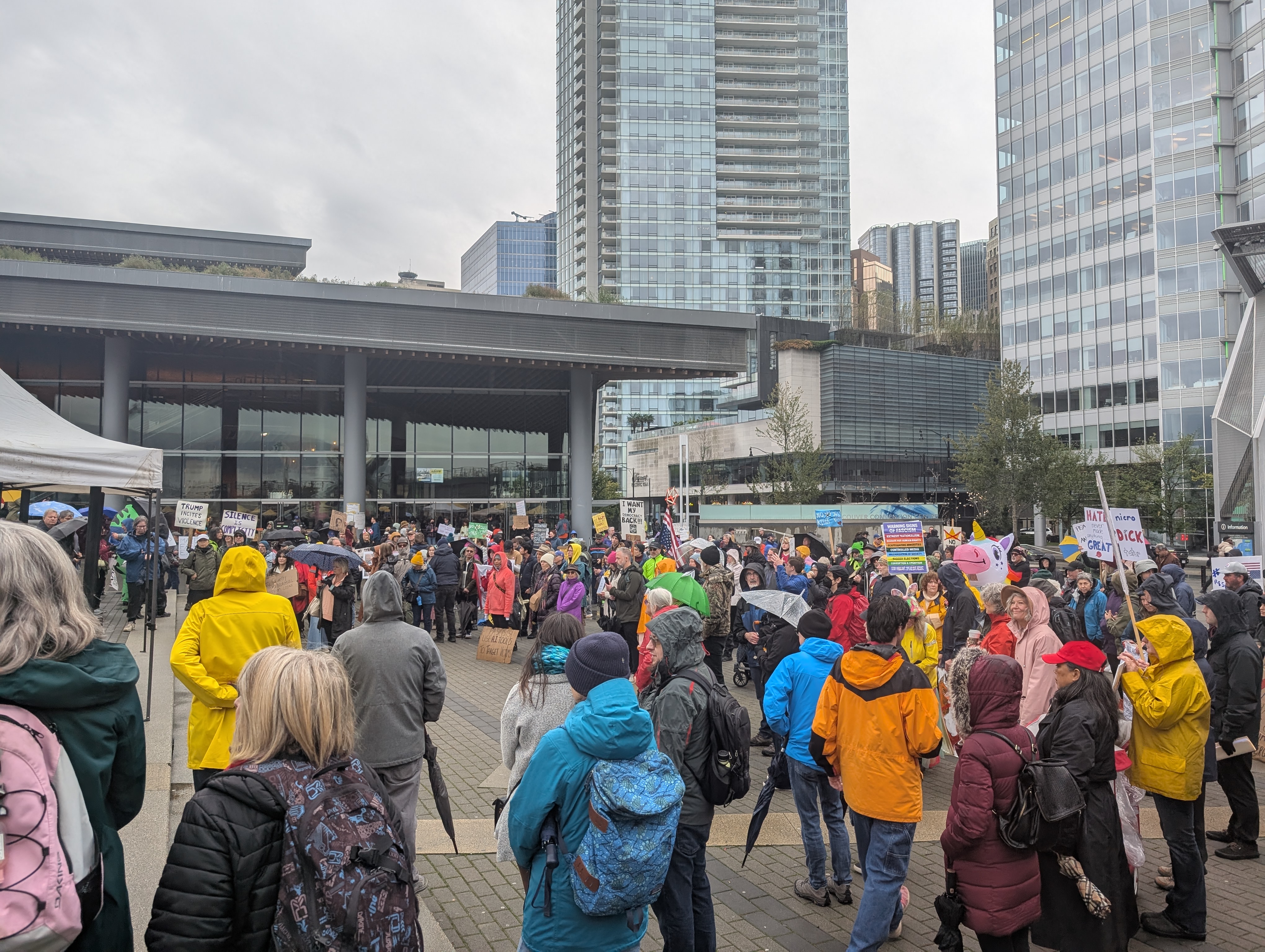 Friends, thank you for being here today — for standing up for democracy, for equality, and for one another. Not just here in Vancouver but for our neighbours in America and for everyone across the world.